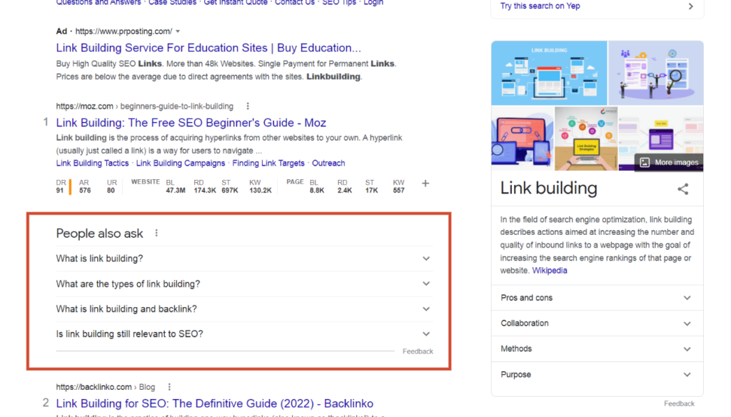 例如,如果你的目标是 “链接建设服务”,很有可能有些人也会搜索诸如 “为什么链接建设”、”链接建设的好处 “或 “链接建设策略”。