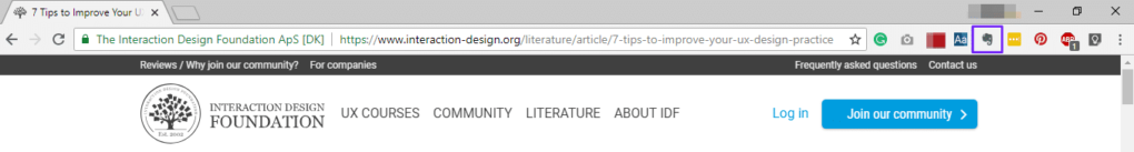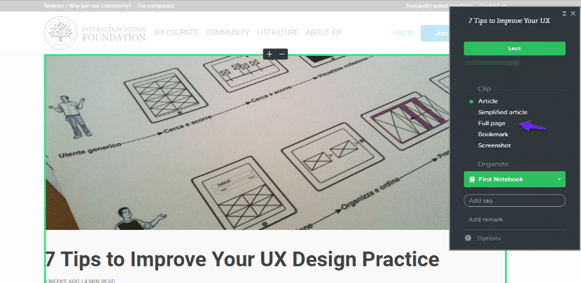 我们选择了 “提高你的用户体验设计实践的7个提示“。当你找到你想保存的东西时,点击右上角的Evernote图标。