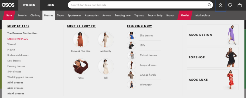 这些标题通常会分出更具体的子类别。正如你所看到的,体育页面包含了与其他较低层次页面的链接,如Explore Football 和 Modest Activewear。