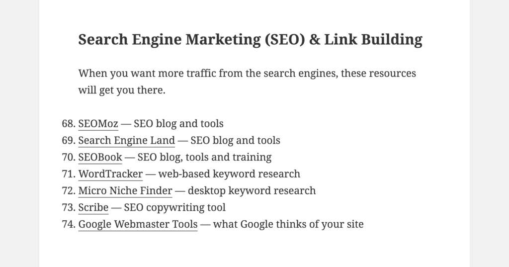 因此,当我需要获取指向我网站的链接时,我通常在这些资源页面搜索字符串中使用“SEO”作为关键字。