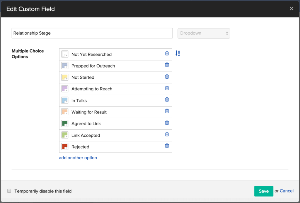 极少数必需的自定义字段之一是关系阶段。这基本上意味着:“我们与那个人的当前状态是什么?”。