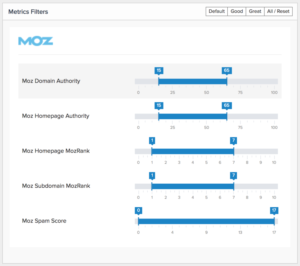 具体来说,您可以按Majestic Citation Flow & Trust Flow、Link Research Tools Power*Trust和Moz指标(页面权限和域权限)进行过滤。