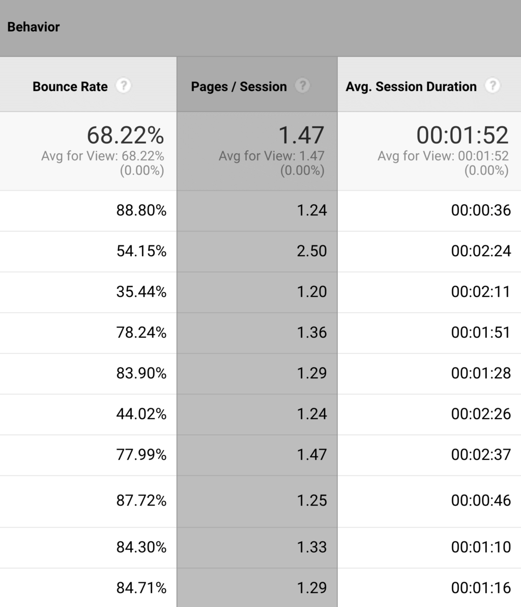 您还需要关注您的跳出率。正如你在我的报告中看到的那样,我的跳出率无处不在。