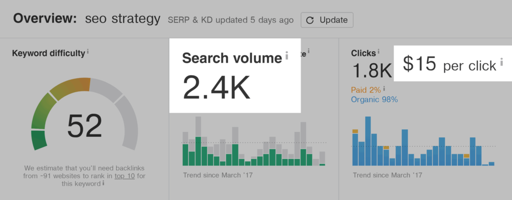 对该页面的目标关键字是“SEO策略”。该关键字每月获得240次搜索(每次点击费用为15美元)。