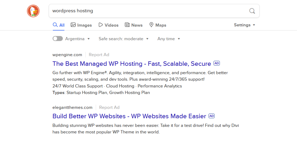 搜索体验本身与其他引擎提供的一致。DuckDuckGo搜索引擎结果页面 (SERP) 包括您习惯的所有元素,例如图像、视频、新闻,甚至地图:
