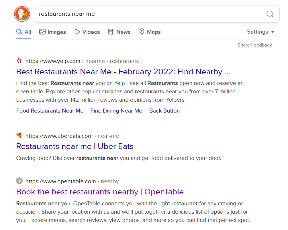 由于DuckDuckGo不收集位置数据,本地SEO可能会变得棘手。搜索引擎会询问您是否要分享您的位置并从Apple地图中提取结果。如果您不同意,诸如“我附近的餐馆”之类的搜索将不会返回准确的结果: