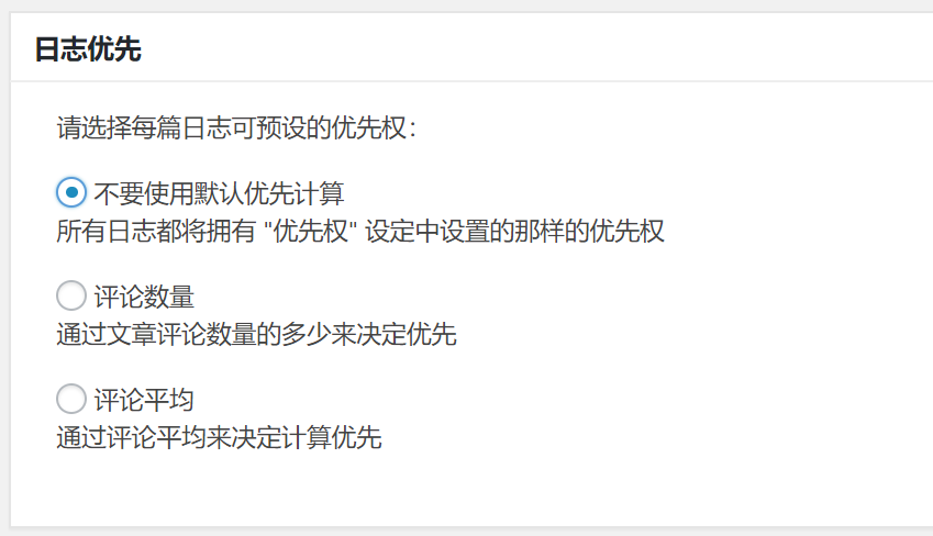 至于日志优先级,个人建议选择“不要使用默认优先计算”。当然,如果你的博客访客留言频繁,也可以考虑使用第二和第三个选项。但为什么不把所有的文章平等看待呢!