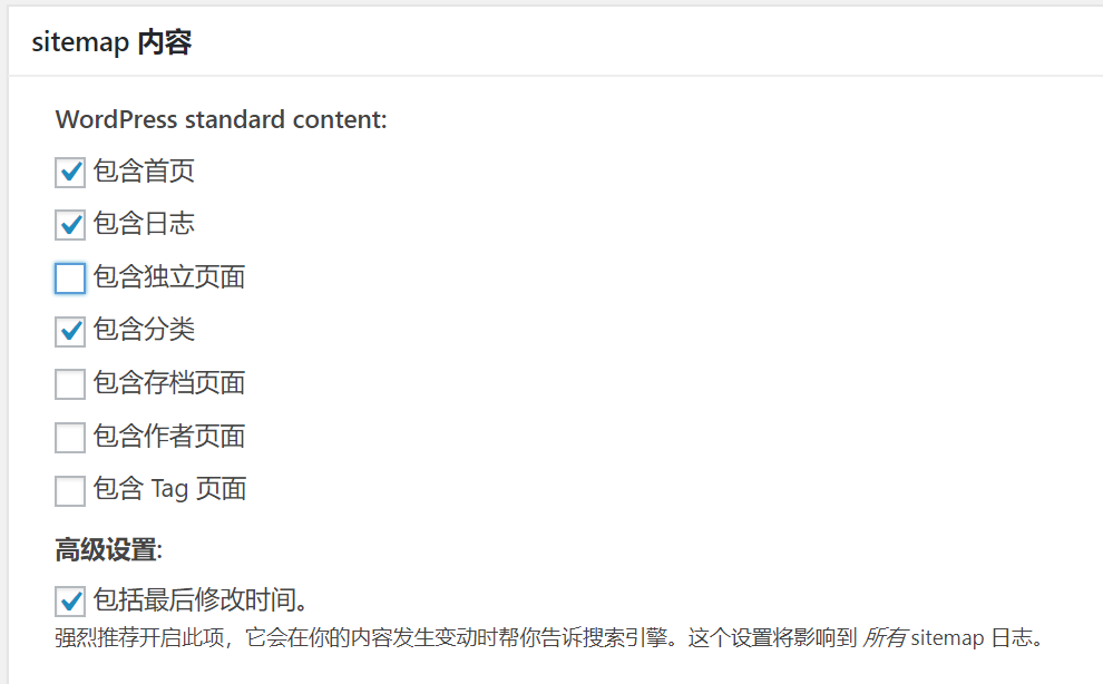 接下来,在“sitemap内容”中指定要添加到站点地图的内容(页面),个人建议使用如下设置: