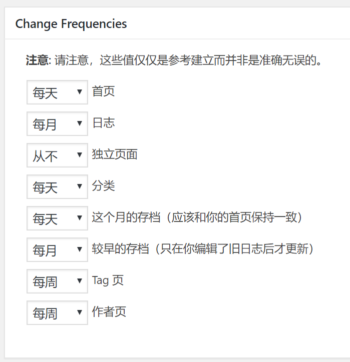 - 每天:类别。如果你的博客每个分类每天都有新的内容必须设置为每天,当然如果你的博客更新并不是很频繁,设置为每周或者每月吧。