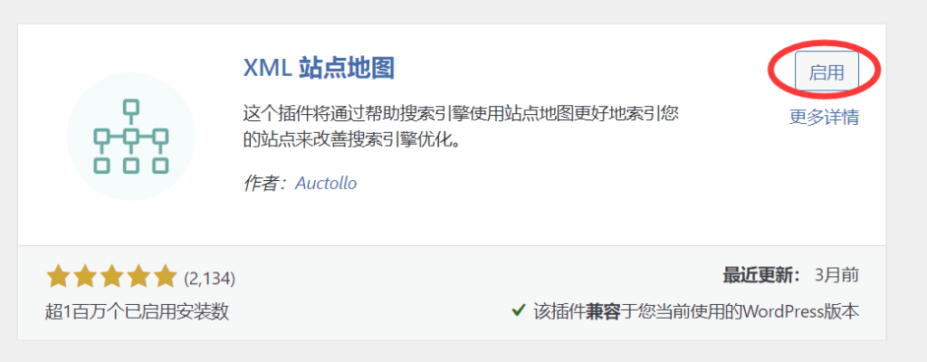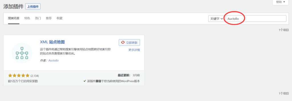 然后在搜索框中输入“Auctollo”。当搜索结果中显示“XML 站点地图”时,请单击“现在安装”。