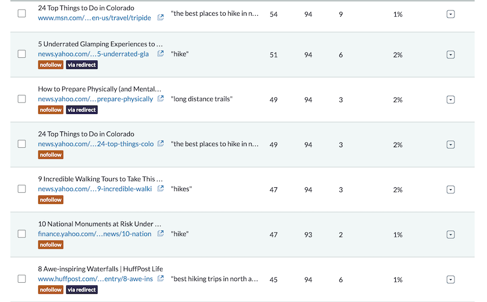 例如,假设我们在博客文章中有目标关键字“北美最佳徒步旅行路线”。您可以将该搜索插入Google并单击顶部结果。获取该URL并通过Moz的Link Explorer运行它,然后查看入站链接。您可以查看链接回该文章的网站,然后您可以决定是否要联系这些网点以请求反向链接(或开始与他们建立关系)。