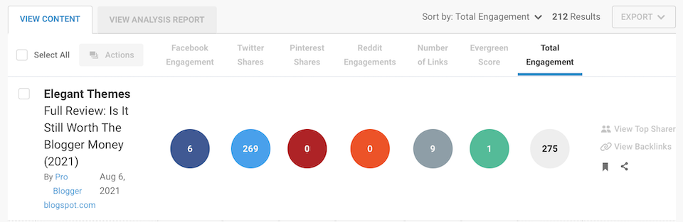 这是BuzzSumo的一个例子。我们搜索了“Elegant Themes”,我们可以检查第一个结果,看看他们是否向我们的网站添加了反向链接。