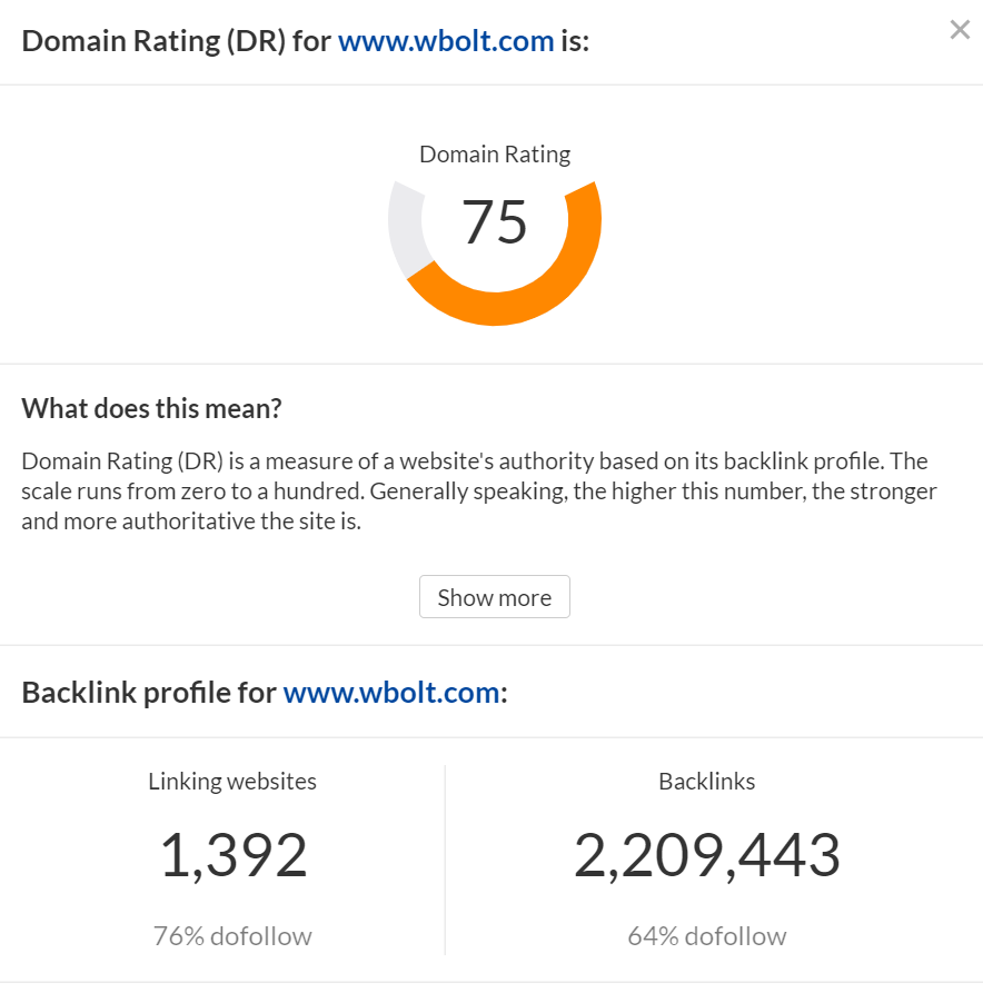 网站拥有的域权限越多,它可以通过该反向链接表明您的网站拥有的权限就越大。Ahrefs有一个免费使用的网站“权重”检查器,因此您可以查看网站的高度评价。