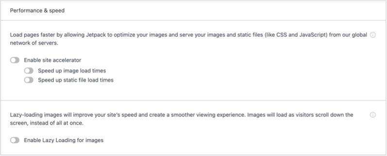 如果您不使用任何其他CDN设置,那么最好的选择是使用Jetpack插件提供的内容加速选项。您可以从Jetpack CDN改进图像和其他静态文件(如CSS和JavaScript)的加载时间。您可以打开“Enable site accelerator”,然后在性能部分下分别打开图像和静态文件。这也将帮助您将WebP图像提供给支持的浏览器,从而修复Google PageSpeed Insights工具中的“以下一代格式提供图像”警告。