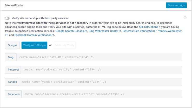 同样,您可以在“Traffic > Site verification”部分下添加来自Google Search Console、Bing网站管理员工具、Pinterest、Facebook和Yandex的验证码。