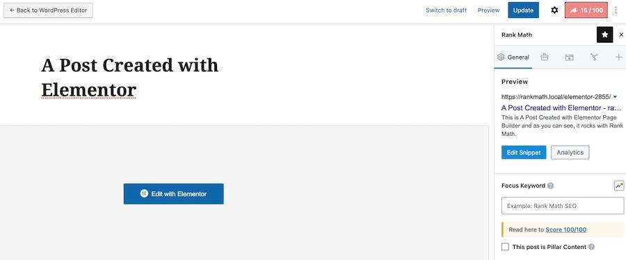 Rank Math是唯一一个通过与Elementor的可视化编辑器紧密集成来解决此问题的SEO插件,因此没有任何关于体验的突出或干扰您将如何定期使用Elementor文章和页面。