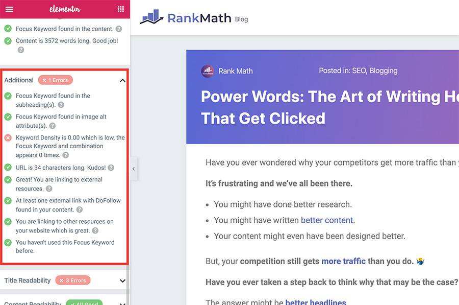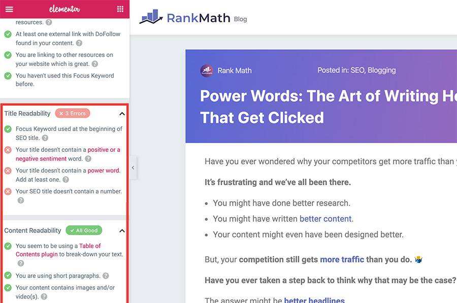 Rank Math的智能建议同样也应用于Elementor页面构建器。