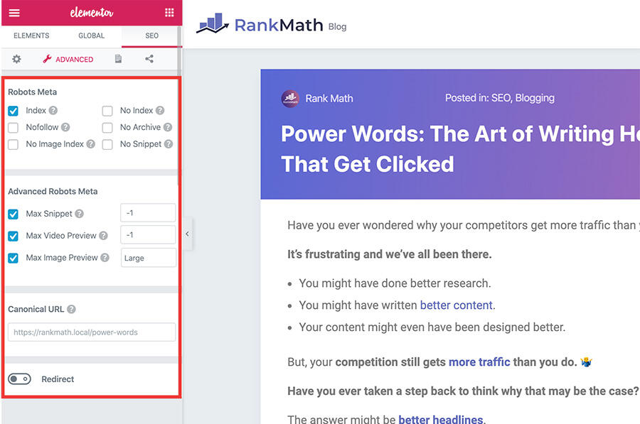 除了我们已经在本演练中介绍的主要设置外,请放心,Rank Math还在Elementor页面构建器中的SEO选项卡中添加了所有基本选项。