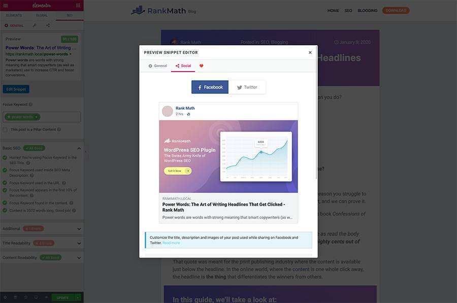 除了能够为搜索引擎设置自定义元标题和描述标签外,Rank Math还可以轻松自定义Elementor文章和页面在社交媒体上的显示方式。