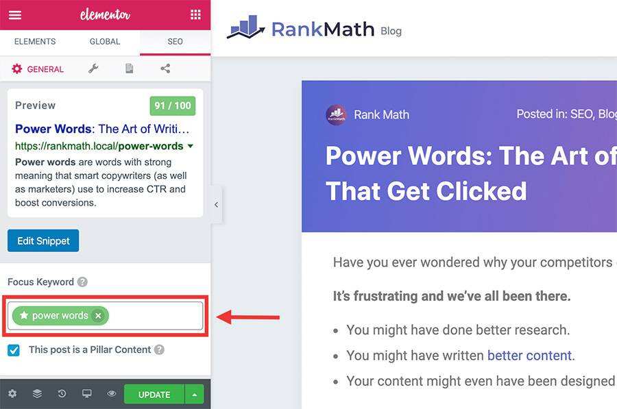 简单来说,focus keyword是您希望文章或页面为其排名的词。这可以是一个单词或一个短语,例如,在这种情况下,我们将其设置为power words。