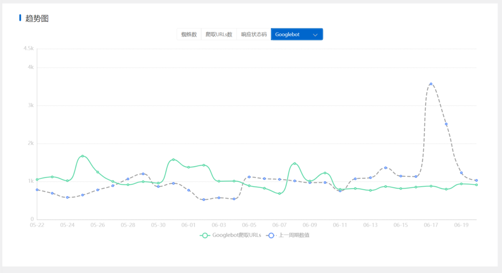 当然,我们的蜘蛛分析插件也可以实现爬虫统计及行为分析,安装启用插件后,当然是统计了一段时间的数据,点击蜘蛛分析>蜘蛛概况,然后选择最近30天,在趋势图下列菜单选择为Googlebot,即可查看Googlebot最近30天URL爬取的数量。