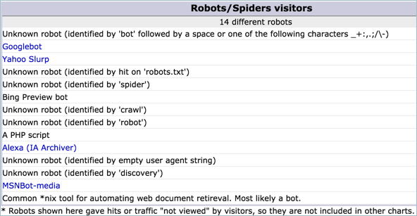打开Awstats应用程序并选择您的站点以查看统计信息。在“Robots / Spider visitors”部分查看最活跃的机器人列表。