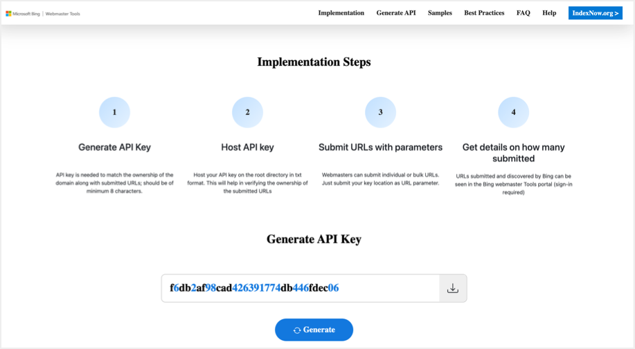 - 从Bing IndexNow网站生成API密钥并将生成的密钥下载为文本文件。