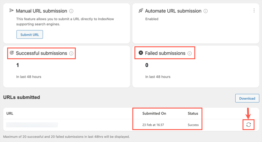 启用该选项后,当您单击编辑器中的“发布”或“更新”按钮时,插件将自动将内容提交到IndexNow端点。您可以在提交成功或失败部分查看状态,并在“URLs submitted”部分查看所有提交的页面。该列表将显示最多20个成功和20个失败的URL。