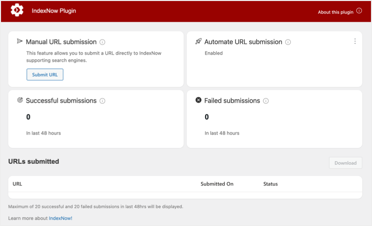 无需特殊设置即可将IndexNow插件与WordPress网站一起使用。它会自动在您的站点上生成API密钥和主机。如果需要,您可以手动提交页面,或者插件会自动将新创建和修改的页面从您的站点提交到IndexNow端点。仪表盘将显示所有提交的URL(手动和自动)以及成功和失败的提交总数。