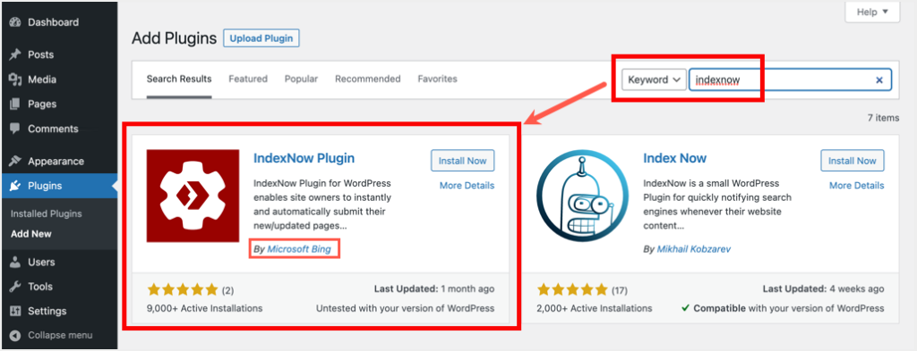 登录到您网站的管理面板,然后转到“插件 > 安装插件”部分。在搜索框中键入“indexnow”以找到“IndexNow Plugin”并将其安装在您的网站上。请注意,还有另一个“Index Now”插件,因此请从Microsoft Bing安装正确的插件。