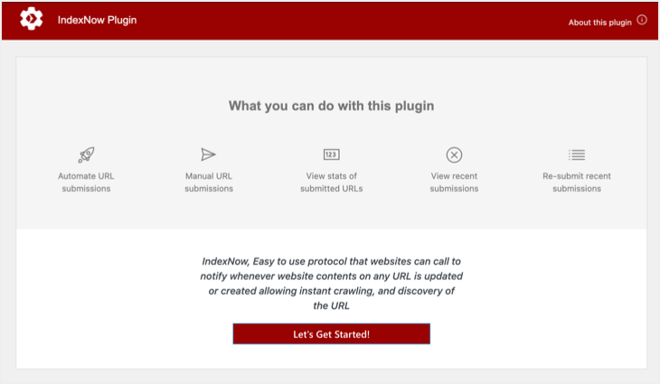激活插件后,从侧边栏中转到“设置 > IndexNow”菜单。本节将显示插件提供的功能摘要,然后单击“Let’s Get Started!” 按钮。