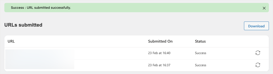 如果您出于任何原因想要重新提交URL,只需单击显示在URL右端的刷新图标。这将立即再次提交您的页面,您将看到列表中添加了一个带有状态的新行。