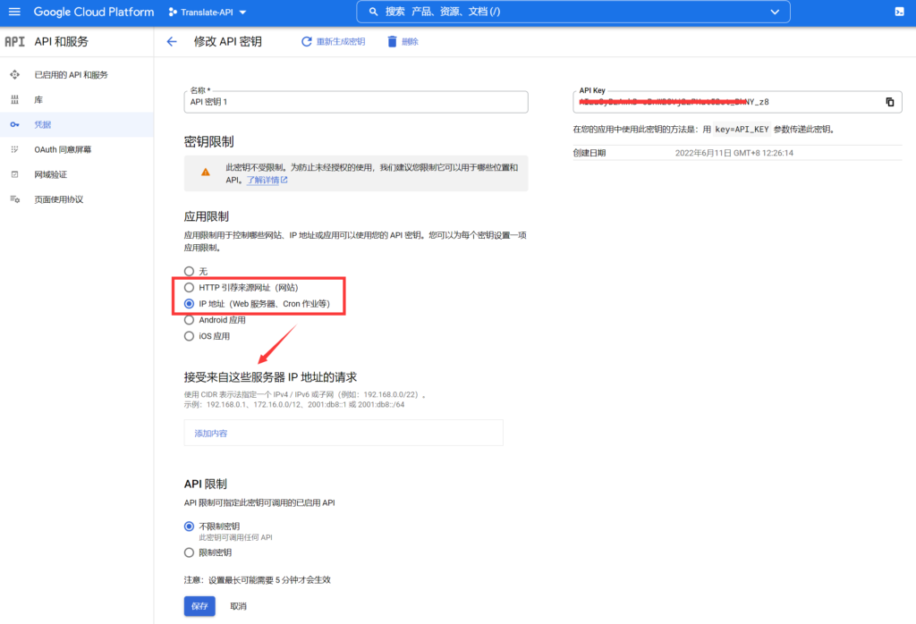 要执行该操作,点击上面截图的“修改API密钥 ”,选择HTTP引荐来源网址或者IP地址,然后添加您需要配置Magicpost插件来翻译文章的网站域名或者网站所在服务器的IP地址。
