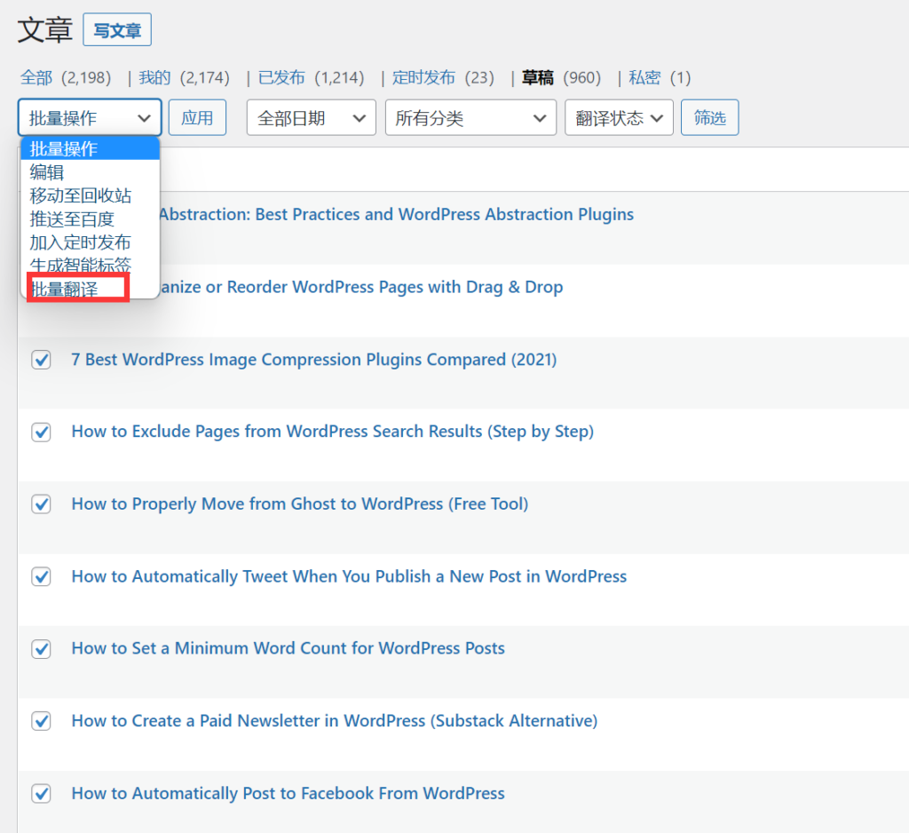 如果需要对多篇草稿执行翻译,则可以在草稿列表中选中你需要翻译的文章,然后在批量操作下拉菜单中选择“批量翻译”