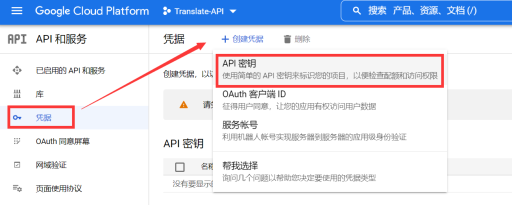 启用Cloud Translation API后,进入API管理页面,点击左侧的“凭据”-“创建凭据”,选择API密钥,如下图所示: