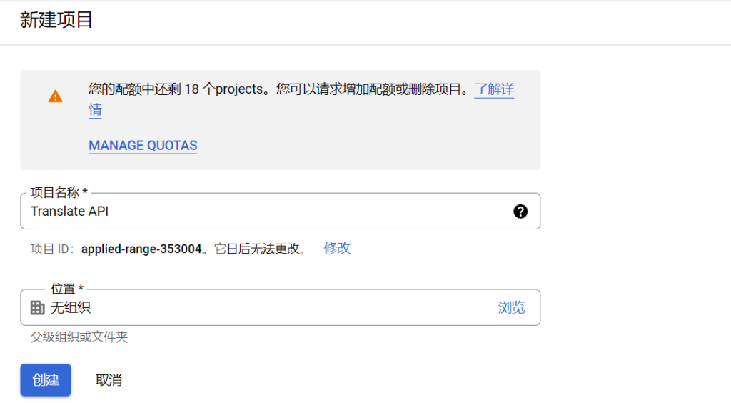 首先您需要点击选择项目以创建一个新的Translate API项目,创建该项目。然后点击继续。