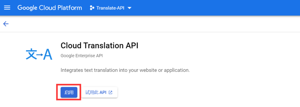 访问谷歌翻译API页面,然后点击“启用”,即在你前面所创建的项目下启用谷歌翻译API。
