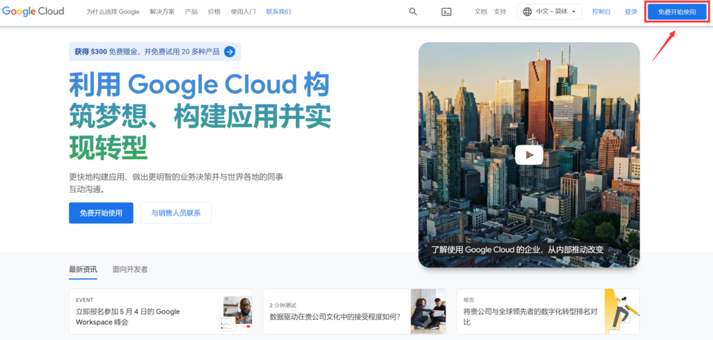 访问Google Cloud谷歌云的网站,cloud.google.com将网站语言选择中文-简体,之后点击蓝色按钮免费开始使用。
