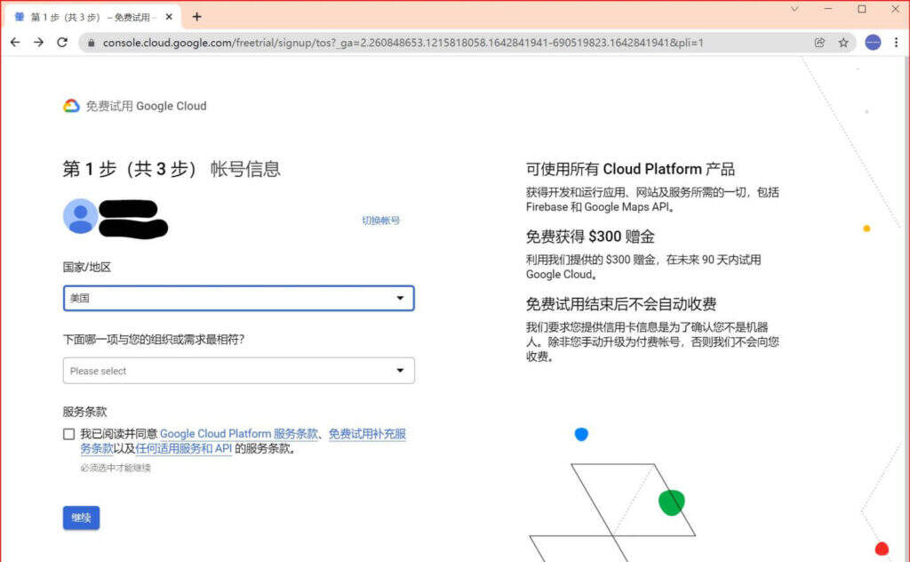 下面正式进入免费试用Google Cloud的申请环节,共三步,第一步帐号信息。
