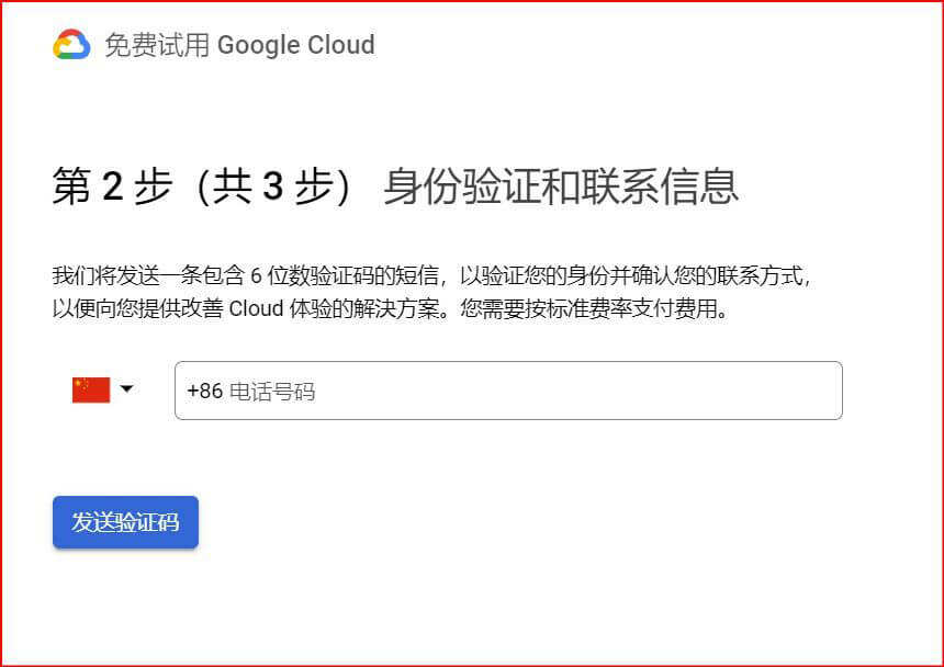 第二步,身份验证和联系信息,输入你的电话号码,用于身份验证后联系信息。Google将发送一条包含6位数验证码的短信,以验证您的身份并确认您的联系方式,以便向您提供改善Cloud体验的解決方案。您需要按标准费率支付费用。在电话号码前面的国旗图标处,点击下箭头向下拉,选择中国+86,在电话号码处填写你国内的手机号码。接收到验证码后,填写继续下一步