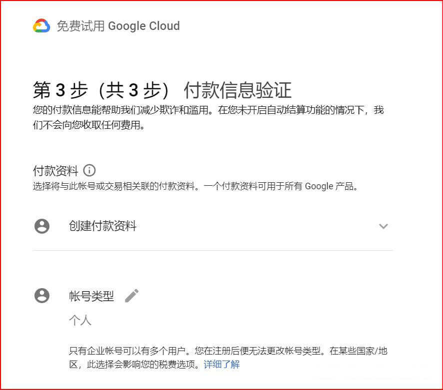 第三步,付款信息验证。这一步是注册Google Cloud谷歌云的关键,需要验证信用卡信息。帐号类型选择个人。