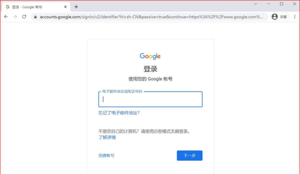 打开Chrome浏览器,使用访客模式打开Google网站,点击右上角登录,开始登录Google帐号。