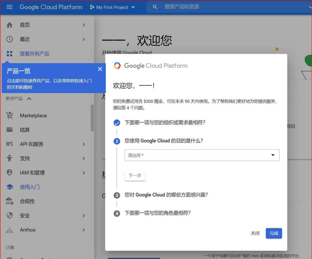 您的免费试用含$300赠金,可在未来90天内使用。现在已经登录到Google Cloud的操作平台界面了。在登陆之前,Google Cloud需要做一个小调查,回答4个问题,当然你也可以选择关闭。问题回答完毕后,点击完成。之后Google会根据您的兴趣,推荐相对应的解决方案,以通过 Google Cloud 托管网站。