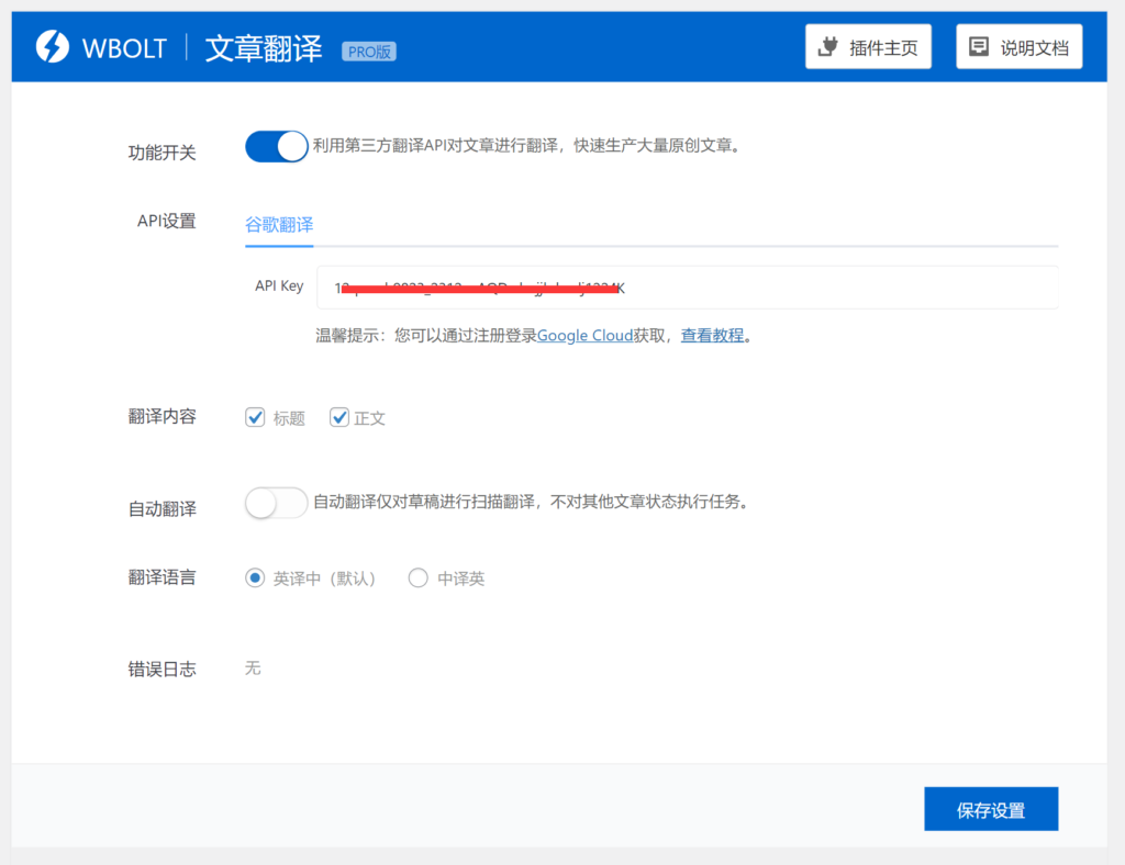 只需转到您的WordPress管理后台Magicpost>文章翻译,打开功能开关,在API设置-谷歌翻译下的API Key填入上面获取到的谷歌翻译API。