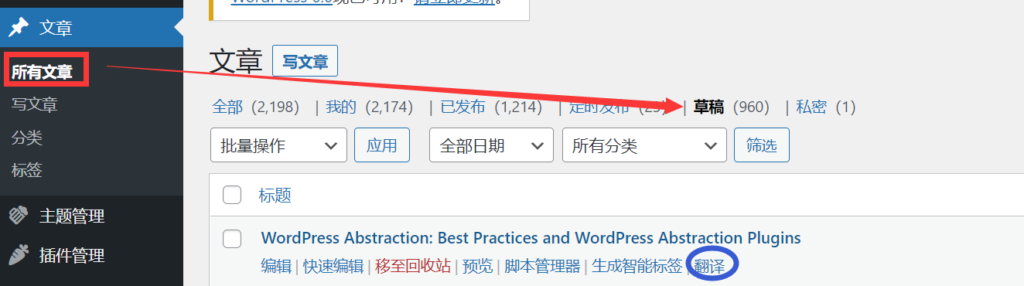 完成上述的插件配置之后,如果你未选择自动翻译。则,需要进入所有文章-草稿。