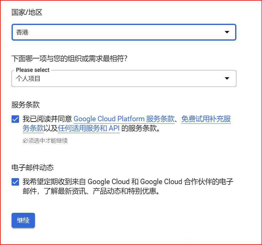 上面两项选择完毕之后,勾选下面的服务条款和电子邮件动态后,点击继续,进行第二步。