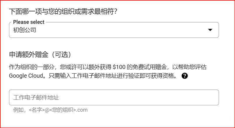 首先填写国家/地区,这里建议选择节点IP所在地,例如你使用的是英国代理,国家/地区就选择英国,使用的美国代理,国家/地区就选择美国(建议选择香港,因为后面需要填写信用卡信息)。国家地区选择完毕后,选择下面哪一项与您的组织或需求最相符?这一步如果选择公司类的,还可以额外获得$100美元的免费试用金(在300美金的基础上叠加),不过你要输入一个企业邮件。