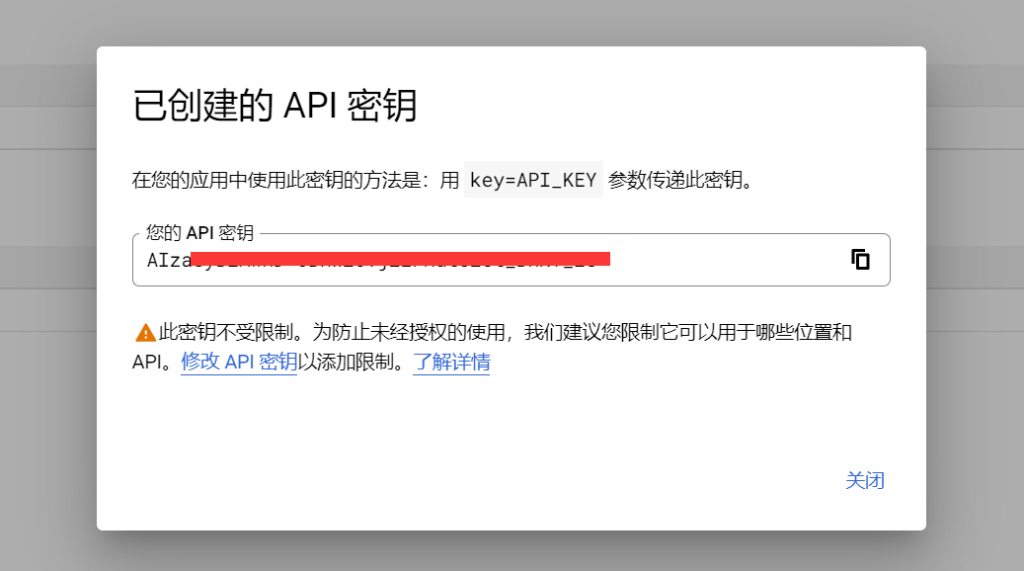 当您看到下面的弹窗,即成功创建谷歌云翻译的API密钥(本地保存API密钥,稍后配置Magicpost插件需要使用到)。
