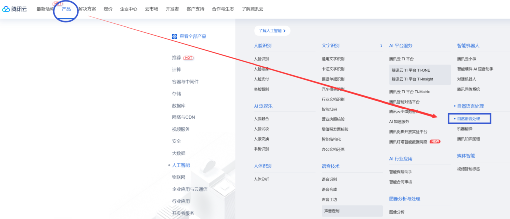 Step 2 -然后登录腾讯云,点击首页“产品-自然语言处理”。