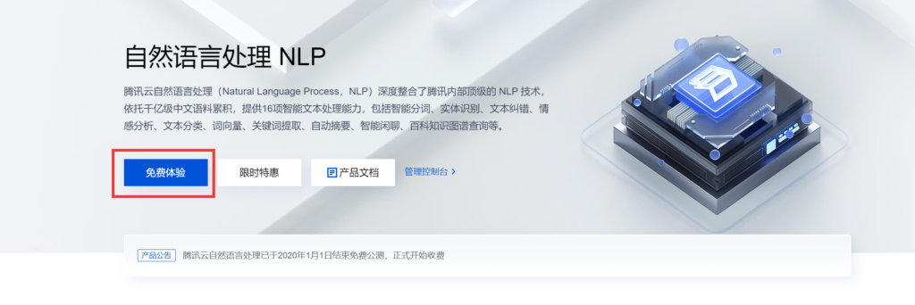 Step 3 -进入自然语言处理产品介绍页面后,点击“免费体验”。